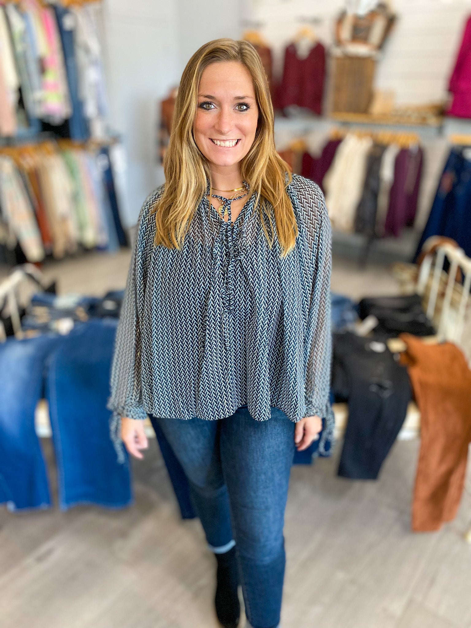 Chevron Print Blouse W/ Tie neck
