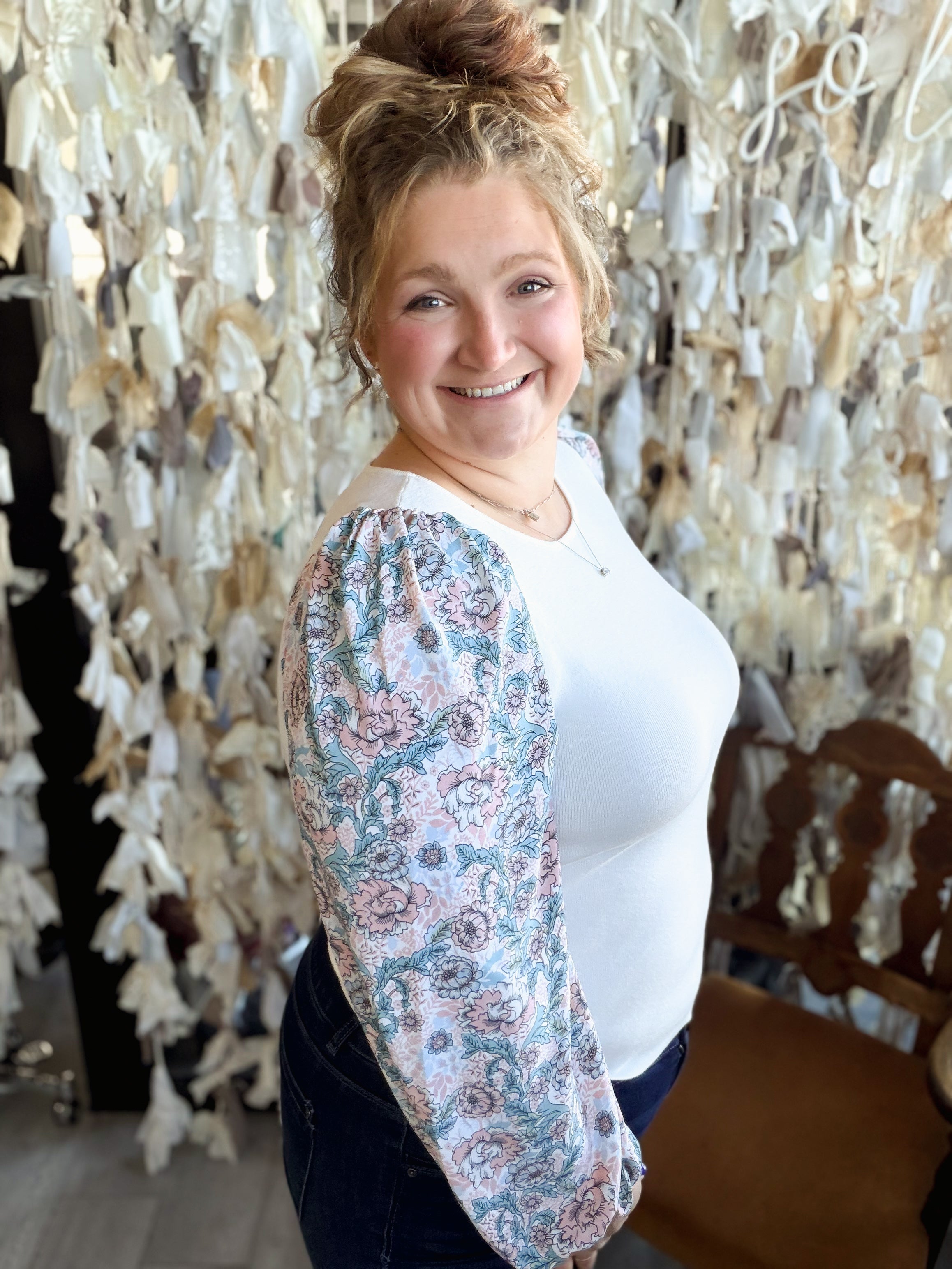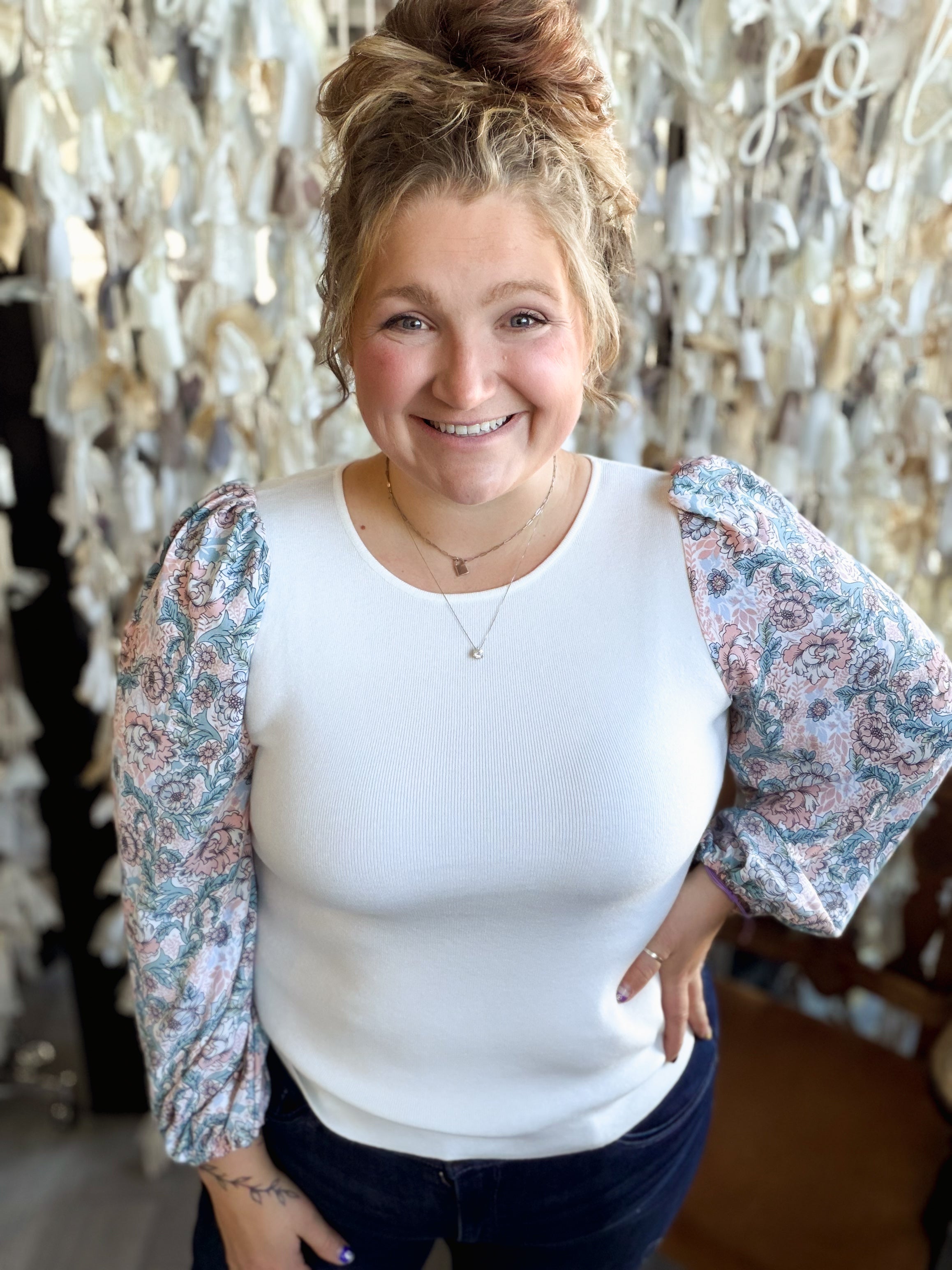 Round neck Sweater W/ Contrast Ballon Sleeves