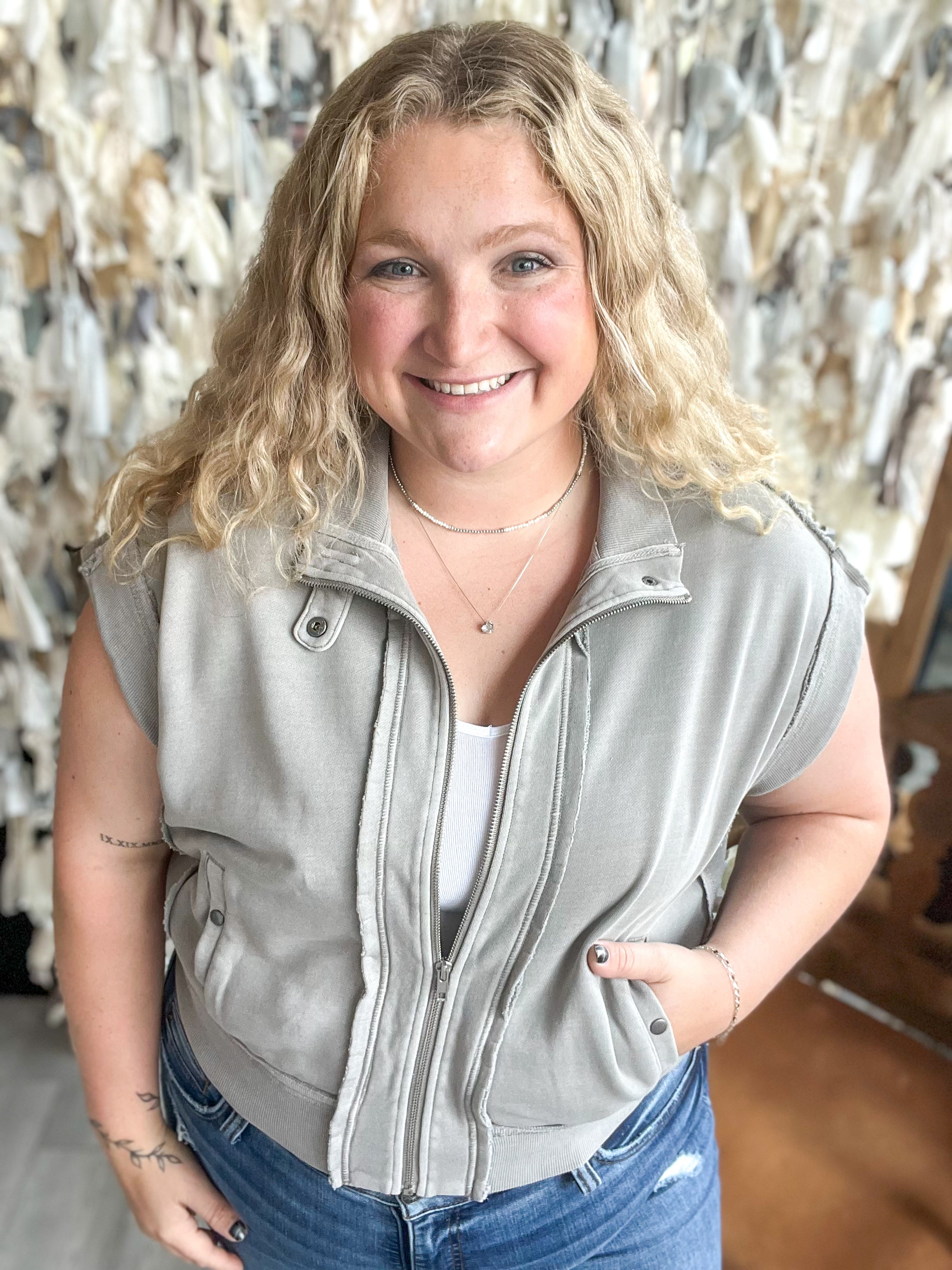 drop shoulder zip-up vets with pockets